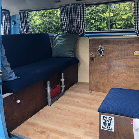 Die Sitzbank ist übrigens auch ein Eigenbau. Die Anleitung hierfür habe ich in dem Buch Jetzt helfe ich mir selbst-VW Campingbus selbstgebaut gefunden. Die Konstruktion ist auch für ungeübte Handwerker nicht allzu schwer, da das wirklich trickreiche daran die Klappscharniere sind und die gibt es einfach passend für jedes Fahrzeug zu kaufen.